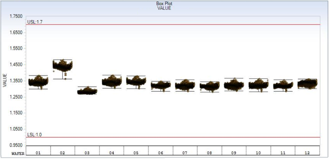 從目前的產(chǎn)出數(shù)據(jù)來看對于部分共性參數(shù),芯片數(shù)據(jù)集中度高,特性一致性好,與原8寸生產(chǎn)相比特性一致。