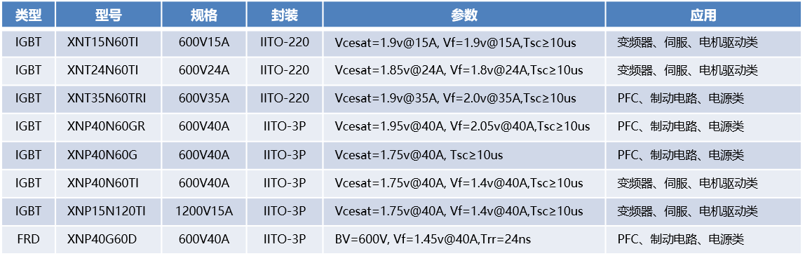 目前芯能內(nèi)絕緣IGBT有兩種封裝形式,IITO-220兼容傳統(tǒng)TO-220、TO-220F封裝形式;IITO-3P兼容傳統(tǒng)TO-3P、TO-247封裝形式。以下是芯能該系列產(chǎn)品的列表,更多信息歡迎垂詢芯能公司電話!