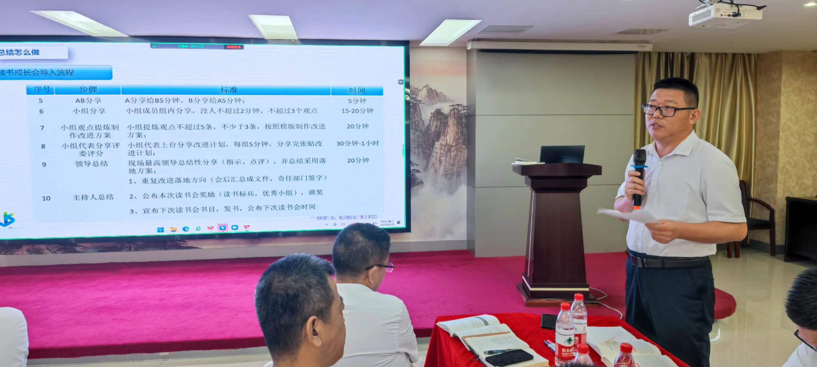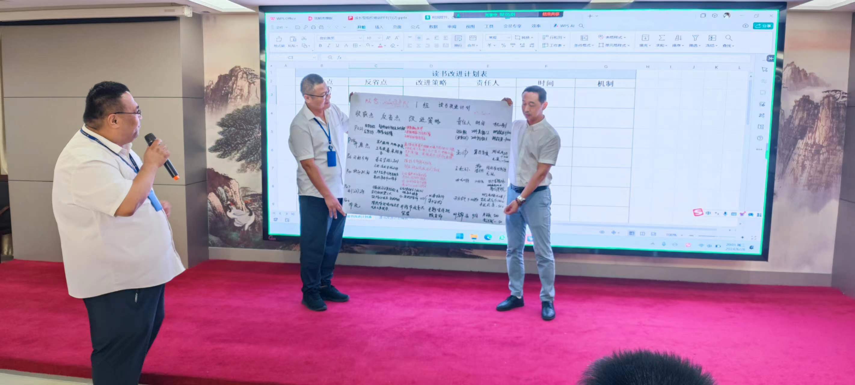 在交流環節,每個小組組長分別上臺發表感言,所思、所想、所悟,并聯系實際工作中的不足與欠缺之處,以及有待解決或尚未發現的問題,大家暢所欲言,無不盡抒。每個小組根據收獲點、反省點、改進策略、責任人、時間、機制相關內容完成了本次學習的《讀書改進計劃表》,并上臺宣讀、講解、公示。